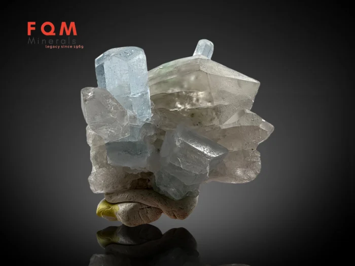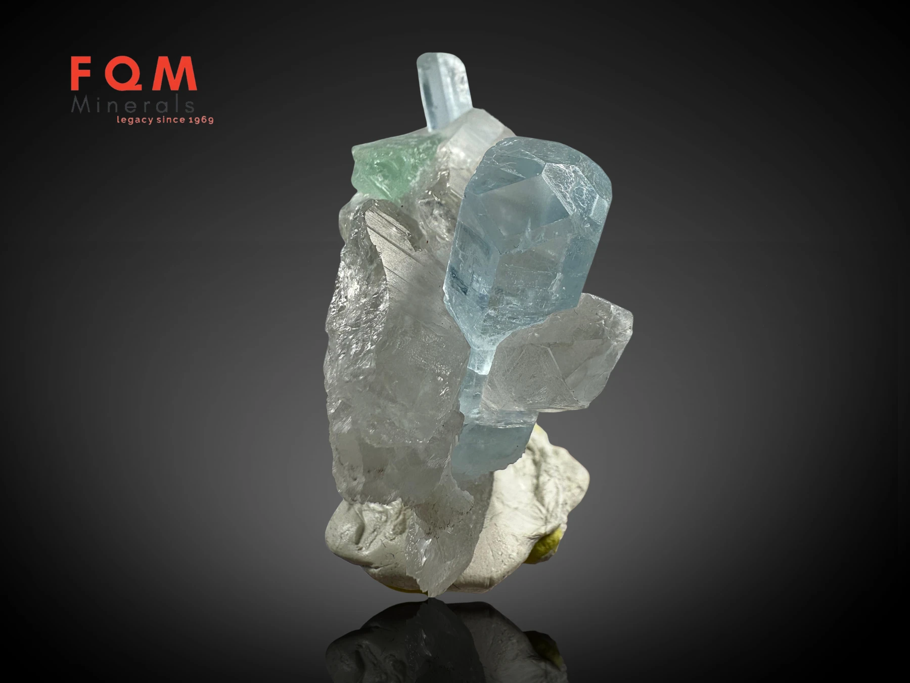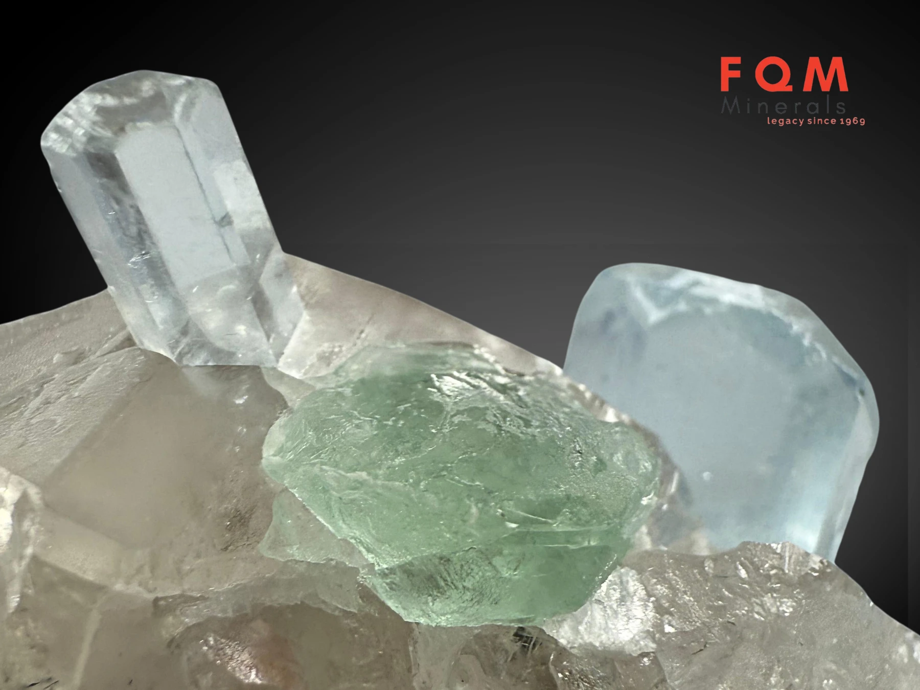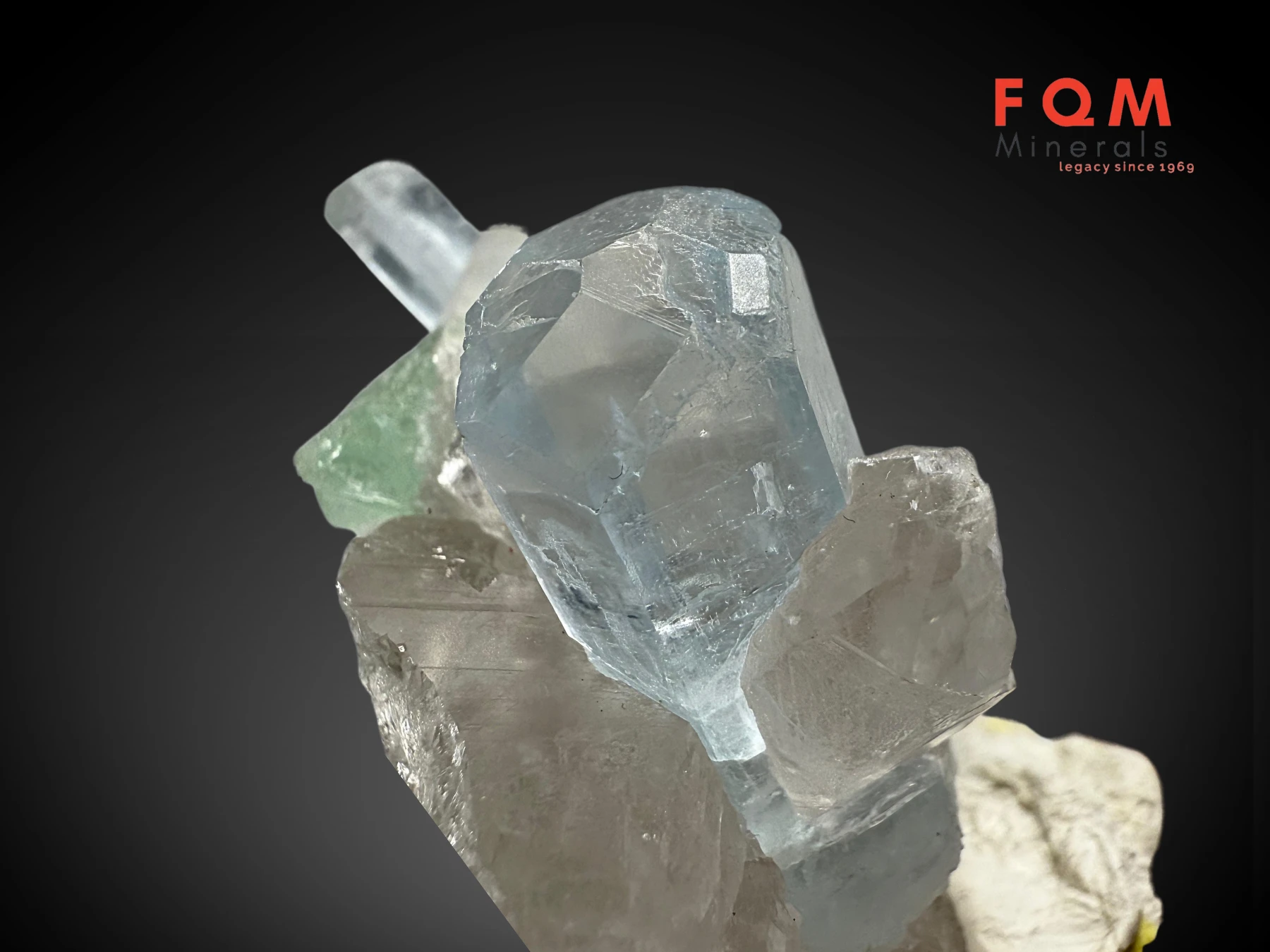 The aquamarine’s precision-like natural termination displays sharp, lustrous faces, radiating a captivating blue hue that contrasts beautifully with the deep green tones of the fluorite. The gwindle-style quartz adds a remarkable twist in both form and rarity, making this piece an exceptional mineralogical treasure.