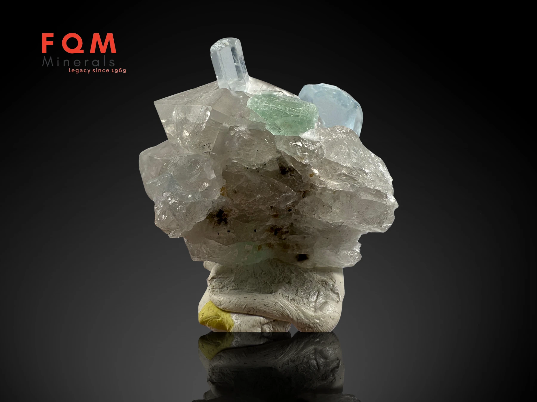 From the legendary mineral-rich region of Shigar Valley comes this exquisite diamond-cut termination aquamarine crystal, harmoniously combined with vibrant green fluorite and a rare gwindle-style quartz formation.