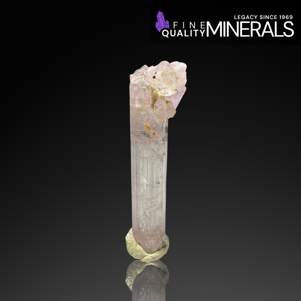 This exceptional specimen showcases a uniquely sculptural pink Kunzite crystal rising vertically with remarkable clarity and soft pastel coloration. Adding to its rarity, the Kunzite hosts an associated Microlite inclusion and a gracefully extended Quartz crystal, forming an eye-catching composition that collectors deeply value.