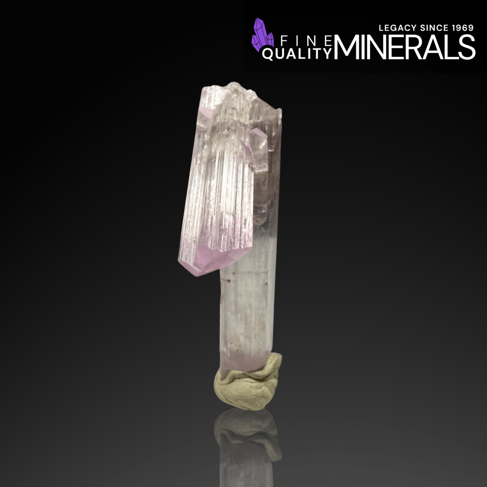A striking and unusually formed pink Kunzite featuring an elegant vertical main crystal with a rare Microlite inclusion and a beautifully attached Quartz partner crystal. Collected from the famous Mawi Pegmatites, Nuristan, Afghanistan, this 44-gram specimen displays soft lilac zoning, excellent clarity, and a highly aesthetic architectural formation.